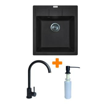 Adamant Набор кухонная Brick, искуственный камень, квадрат, без крыла, 460x515x200мм, чаша - 1, врезная, черный + смеситель и дозатор