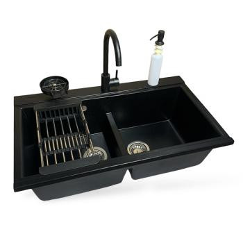 Набор Adamant Similar включает двойную мойку из искусственного камня расширенного формата и комплект дополнительных аксессуаров – смеситель, дозатор, ополаскиватель стаканов и коландер. Прямоугольная форма и увеличенная глубина создают удобство при готовке и мытье посуды. Технология Solid Surface обеспечивает надежность, устойчивость к механическим воздействиям и легкость ухода. Ополаскиватель и коландер ускоряют рабочие процессы и помогают поддерживать порядок. Подходит для тех, кто ценит функциональность и современные кухонные решения.