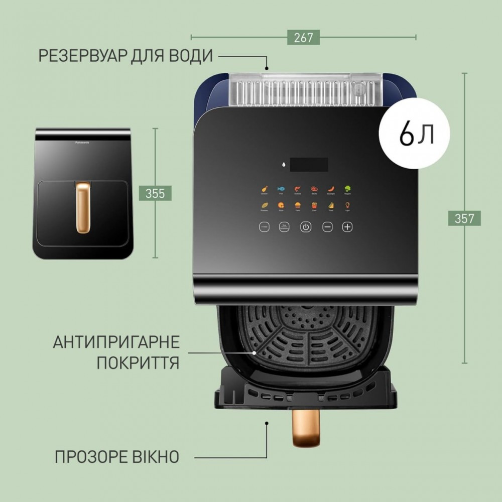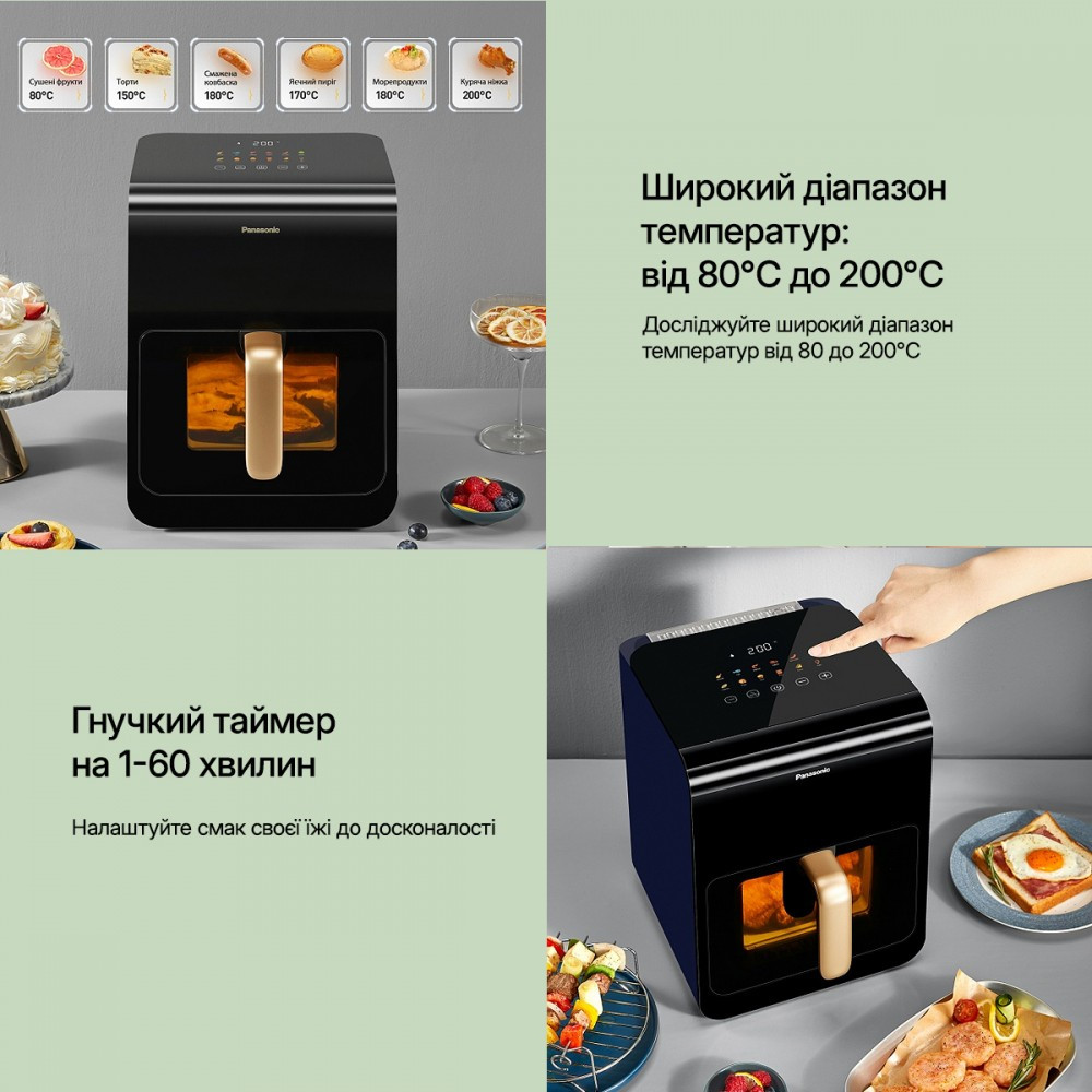 Мультипіч об'єм чаші 6 л і корпус з пластику, підтримує такі функції приготування, як випічка, гриль, запікання овочів і м'яса, смаження у фритюрі, а також сушарка/дегідратація. Робоча температура становить від 80 до 200 °C. Нагрівальний елемент — металевий ТЕН, а потужність пристрою — 1450 Вт. Оснащений сенсорним дисплеєм, має функцію приготування з парою та оглядове вікно.