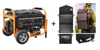 Набор Neo Tools включает бензиновый генератор мощностью 3 кВт с системой AVR и складную солнечную панель мощностью 15 Вт. Решение предназначено для автономного электроснабжения дома, на даче или в путешествиях. Генератор поддерживает стабильное напряжение 230 В, а солнечная панель обеспечивает зарядку мобильных устройств через USB.