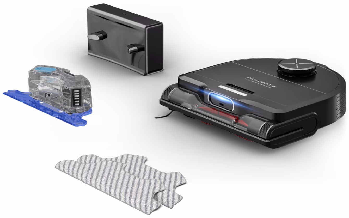Робот пилосос для сухого/вологого прибирання, робота від літій-іонного акумулятора, центральна обертова щітка Electro-brush, бічна щітка 1, безщітковий мотор, 4 рівні потужності, планування за розкладом, під'єднання через Wifi (застосунок роботів Rowenta та голосових помічників), програмування завдань, вибір приміщень для прибирання (прибиральне прибирання, що налаштовується), тип зарядного пристрою: док-станція, самопідзаряджання, швидке зарядження.