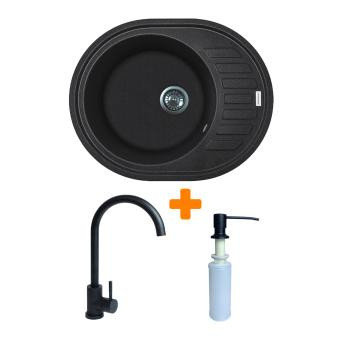 Adamant Набор кухонный Ovum, искуственный камень, овальная, с крылом, 615х495х200мм, чаша - 1, врезная, черный + смеситель и дозатор