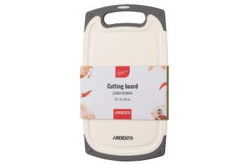 Кухонная доска с желобом размера – 25 × 15 × 0,8 см имеет прямоугольную форму с закругленными углами. Она изготовлена из пластика белого цвета. Имеет противоскользящий борт из термостойкой резины черного цвета. Для удобства при использовании предусмотрено отверстие, за него можно повесить аксессуар на крючок. Можно мыть в посудомоечной машине.