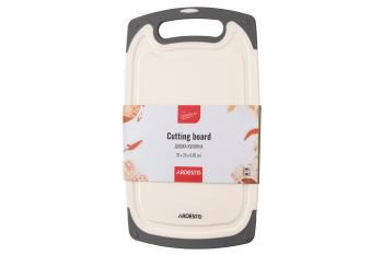 Кухонная доска с желобом размера – 33 × 20 × 0,85 см имеет прямоугольную форму с закругленными углами. Она изготовлена из пластика белого цвета. Имеет противоскользящий борт из термостойкой резины черного цвета. Для удобства при использовании предусмотрено отверстие, за него можно повесить аксессуар на крючок. Можно мыть в посудомоечной машине.