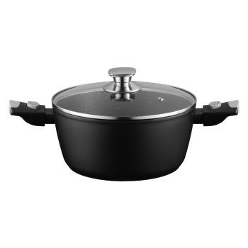 Кастрюля ARDESTO Gemini Bari объемом 3,9 л – надежная посуда для приготовления больших порций. Черный цвет изделия придает выразительности, а дизайн – ощущение упорядоченности на кухне. Кованый алюминий обеспечивает равномерное распределение тепла, а двухслойное мраморное покрытие Xylan Plus не дает шансов пригоранию. Все сбалансировано для стабильной работы: диаметр 24 см, высота стенок 11 см, толщина дна – 4 мм. Съемную бакелитовую ручку легко отсоединить перед запеканием в духовке (до 220 °C), а стеклянная крышка с отверстием для пара и элементами из нержавеющей стали позволяет контролировать процесс без потери тепла. Совместима с газовыми, электрическими, стеклокерамическими, галогенными и индукционными плитами. Кастрюлю легко очищать в посудомоечной машине.