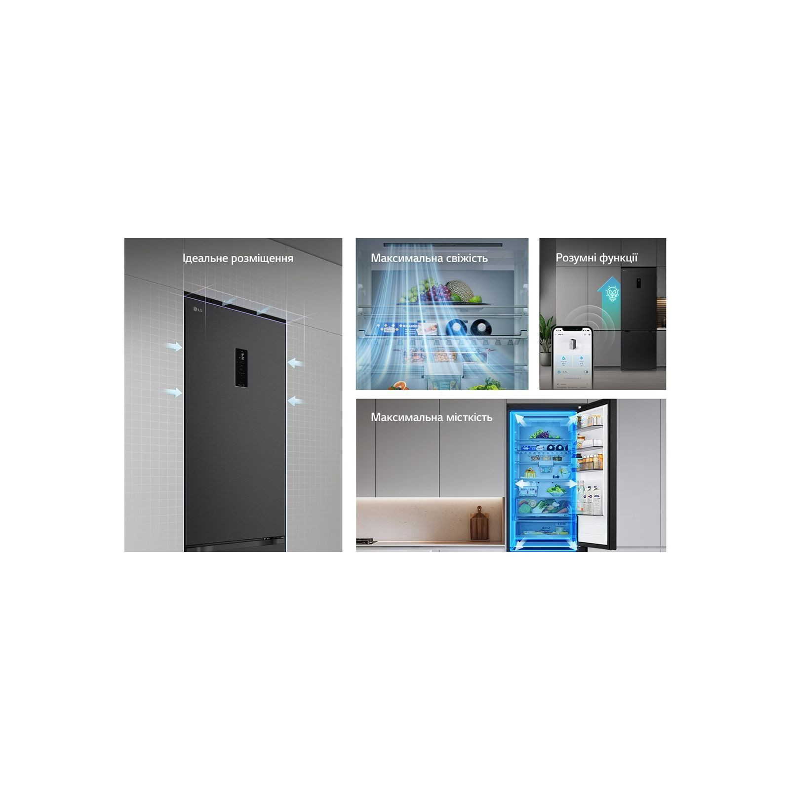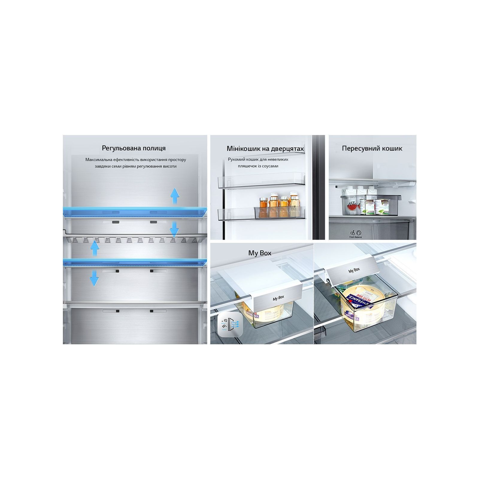 Додаткові функції: зона свіжості fresh converter, регулювання температури морозильного відділення, регулювання температури холодильного відділення Додатково: eco friendly, технологія контролю напруги, антибактеріальний ущільнювач bio shield, експрес заморозка, Fresh Balancer, пересувний кошик, metal fresh, Linear Cooling, перенавішування дверей, сигнал відкритих дверцят, багатопотокова система охолодження multi air flow, нульовий зазор, металеве декорування полиць та ящиків, кришка moist balance crisper, винна полиця, doorcooling+, лоток для заморожування льоду, міні кошик на дверцятах, інтелектуальна система діагностики smart diagnosis, висувний контейнер для дрібної їжі my box, складана полиця, прозорі дверні кошики, висувні контейнери, lg thinq з керуванням через wi-fi