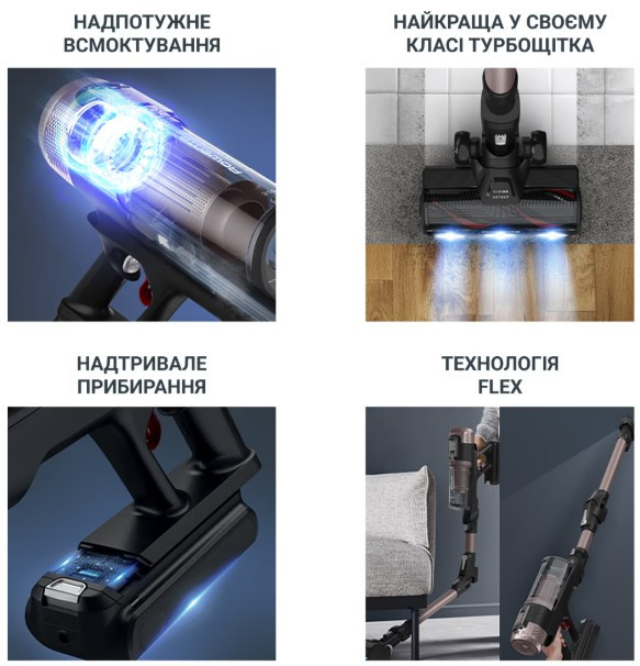 Вертикальний бездротовий пилосос для сухого та вологого прибирання оснащений контейнерним пилозбірником об’ємом 0,65 л і системою фільтрації HEF, має споживану потужність 780 Вт та потужність всмоктування 315 Вт, працює у 4 режимах з регулюванням потужності на корпусі, рівень шуму становить 79 дБ.