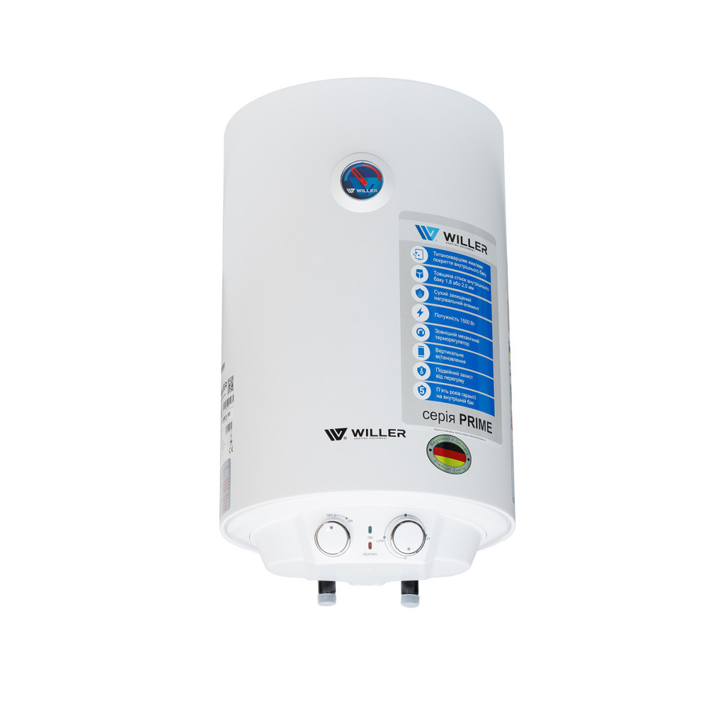 Надійний накопичувальний електричний водонагрівач WILLER EV50DR-Prime циліндричної форми об'ємом 50 літрів. Оснащений сухим нагрівальним елементом із нержавіючої сталі, потужністю 1500 Вт. Внутрішній бак, виготовлений із сталі, покритої титанокварцевою емаллю, та захисний магнієвий анод забезпечують тривалий термін експлуатації. Сфера застосування – нагрівання води для побутових цілей, для душу та ванної. Для використання у будинку, квартирі, на дачі.
