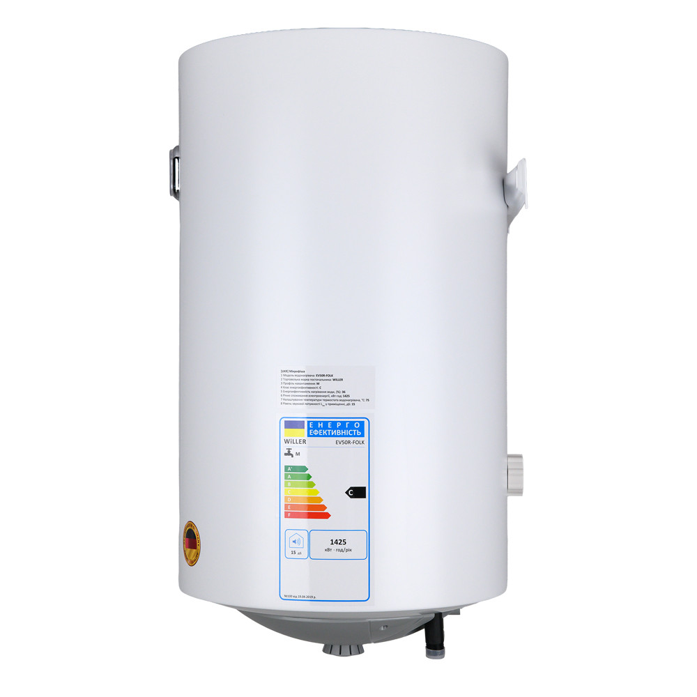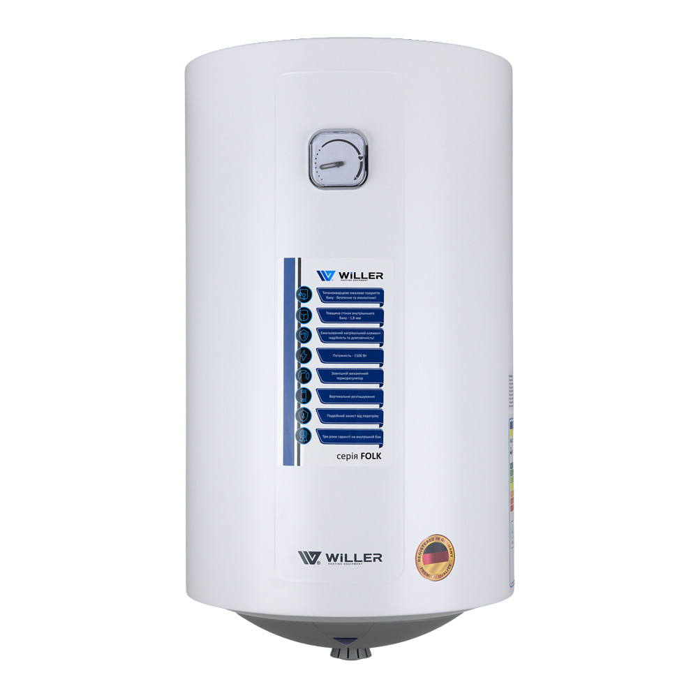 Надійний накопичувальний електричний водонагрівач WILLER EV50R-FOLK циліндричної форми об'ємом 50 літрів. Оснащений занурювальним (мокрим) нагрівальним елементом потужністю 1,5 кВт. Внутрішній бак, виготовлений зі сталі, покритої титанокварцевою емаллю, і захисний магнієвий анод забезпечують тривалий термін експлуатації. Сфера застосування - нагрівання води для побутових цілей, для душу і ванни. Для використання в будинку, квартирі, на дачі.